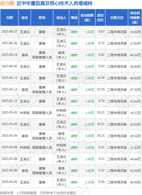 佳力图近半年内的董监高及核心技术人员增减持详情如下: